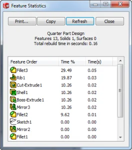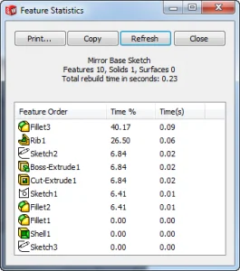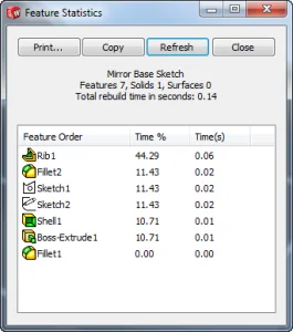 Also in comparing our 1/2 to our whole model we are starting to see a saving in overall rebuild time as our Rib on the Full part takes twice as long to rebuild. The other advantage of creating a Half model is the benefit of only have to create 1/2 of the sketch entities and relations so there is less that can potentially go wrong with changes in the future.