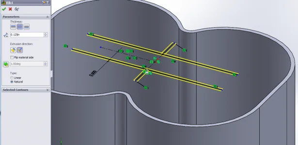 For the hard way we can create a sketch on the top face of our part and draw out all of our ribs making sure all of the line extend to the correct place on the model to add the width to the rib we can either use Offset Entities in our sketch or we can extrude out the feature as a Thin Extrude. All of this will work fine but we have to think about future changes to the model and how many relations and sketch entities are relying on other geometry and any change to those can effect weather the ribs rebuild properly. Also if you are extruding up to the bottom surface and it has Fillets like our part has you have to worry about your Extrude feature going beyond the wall of the part.