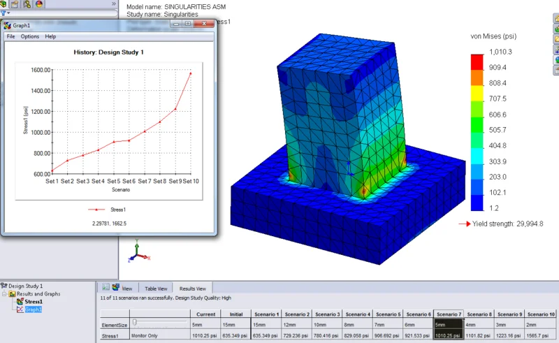 When the Design Study is finished running all of the scenarios, you will have a plot for each constraint utilized. In the picture below, the stress plot from one of the scenarios is shown. I’ve also added a ‘Local Trend Graph‘ to show the stress concentration model does, indeed, show a diverging solution with regards to stress.