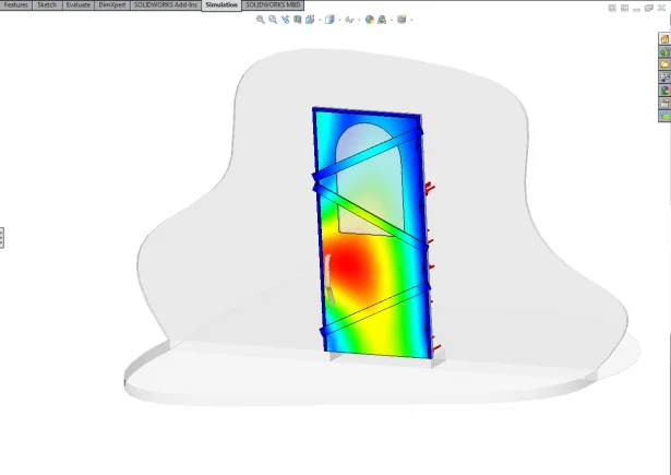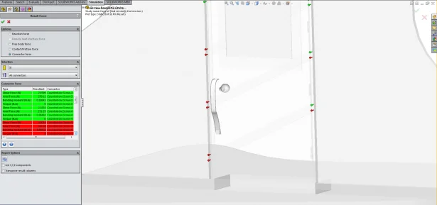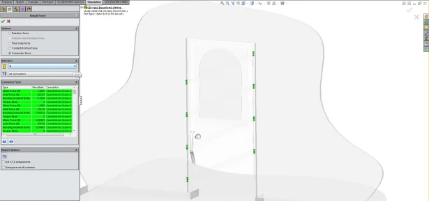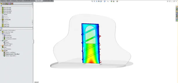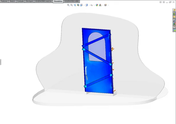 Now I don’t have nails inside of SOLIDWORKS Simulation so I will have to use bolts and set a failure load equivalent of the nail pull out force. Lastly I will need to apply the load on this door due to the mass of zombies pushing against the door. Now theoretically there should be a limit to this load because at some point the mass of zombies would crush the zombies at the front rather than increase the load. After quick scan of the internet I found information on crowd safety barriers and, assuming a healthy safety factor, I now have my zombie crush pressure. As all we are interested is the door we are going to ignore the wall, and assume the door frame is perfectly attached to the house walls. After adding contact between all the components we are ready to run the test.