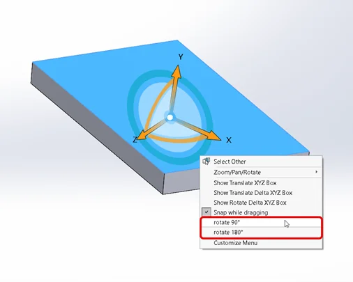 - You can also select the degree values for precise orientation (e.g., 90°, 180°) by right-clicking the Triad. Make sure the part is not fixed while performing Step 4.2