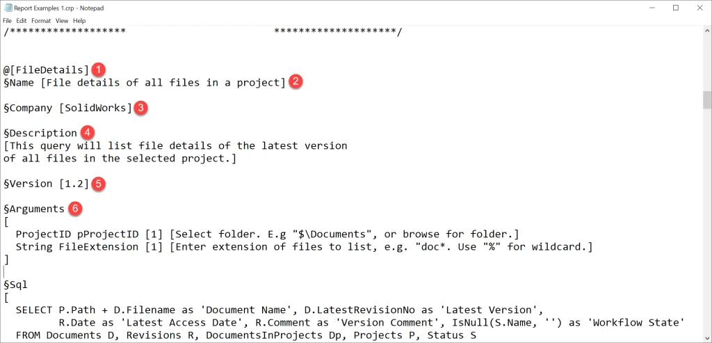 The report tool in SOLIDWORKS PDM Professional allows users users to create, save, and print detailed information about files from the Microsoft SQL database. It is a great substitute to use instead of SQL server management studio for the extraction of information from a database. Reports utilize the read-only subset of DML in Microsoft T-SQL, which means there is no risk that a user will make a change in the database from writing or running these scripts. Another advantage to running reports is that we can utilize the power of Report Query Arguments. This capability allows us to dynamically choose values to use as query parameters. This is very, very useful, and makes life easier for both the programmer and the end user. Detailed information on how to use and create reports can be found in the SOLIDWORKS PDM Administration Guide, under Chapter 3 (Vaults). The example we will discuss can be found in the PDM installation directory; C:Program FilesSOLIDWORKS PDMReport Examples 1.crp The following image shows a basic structure of a query. This article will focus on Step 6, the query argument tool that Prompts the User for input.