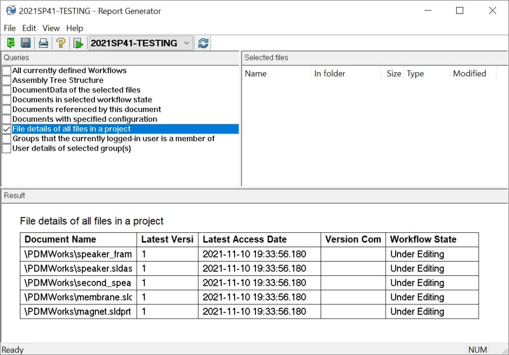The query below is extracted from the same report ‘File details of all files in a project’. I red boxed two important components of the query. In this query we want to view the file details of all files within the PDMWorks folder. First we figure out from the database which ProjectID is the PDMWorks folder, which turns out to be 7. Then we use the % symbol to choose all filetypes. This gives us the 5 results on the bottom.