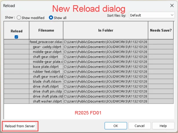 If you’re working on files that are saved to 3DEXPERIENCE, the Reload command will display a Reload from Server button as shown in new Reload dialog.