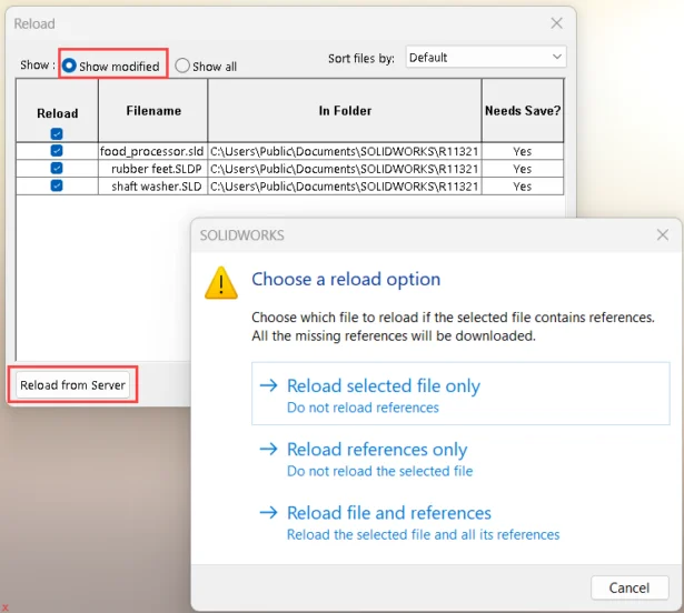 Benefits: The advantage of using the Reload from server command from SOLIDWORKS reload dialog is – Along with reload options, it provides you the list of modified components as well as all components available in the assembly. Refer the below image.