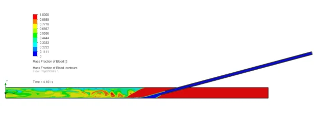 To demonstrate this 2019 SP1.0 capability enhancement an ‘Intravenous’ therapy (IV therapy) is modeled. Further assumptions has done to model sample ‘Intravenous injections (IV)’, involve inserting a needle into a vein allowing saline water to be delivered directly into the bloodstream. In this example, a Gauge Size 20 needle (Color -PINK) is modeled with 0.6 mm inner diameter suitable for small Vein (approximately 1.50 mm ID & 1.55 mm OD). For ‘Saline Water’ a new fluid is added to the Engineering Database, and ‘Blood’ is defined, as it is available in the Engineering Database. Since saline water, is a mixture of sodium chloride (NaCl) & water and has viscosity 1.011 cP (wt 0.5% ), for new fluid definition all properties assumed identical to water. Effectively, blood is a non-Newtonian liquid, while saline water is Newtonian. Flow simulation does not simulate the fluid mixing; we can visualize / animate the interface plotting the mass / volume fraction of one fluid in a cut-plot.