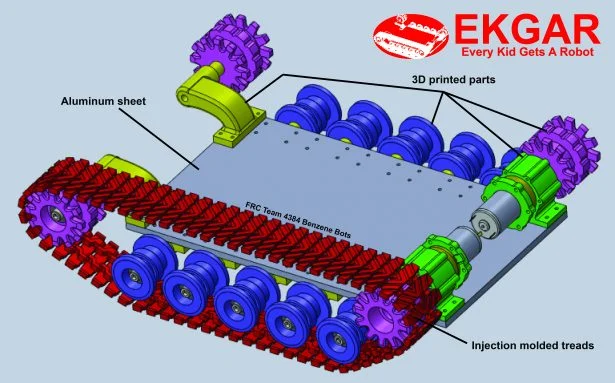 “Last year I started our business team and I was coming up with our mission statement,” Danielle explained. “I was thinking about how we can have constant touch points with students, because I’ve seen a lot of outreach where you see the student once and you never talk to them again, you never see them again. So it’s kind of my passion to have these constant touchpoints with students, which is something the EKGAR is.” EKGAR is a way to connect underserved communities with STEM, and make STEM programs like FIRST accessible and sustainable for everyone. Designed in SOLIDWORKS and controlled via an app Sanket created, the majority of the robot is 3D printed with files that can be found publicly in Benzene Bots’ Github page. Using Github is a way to share EKGAR with the larger community, and allows students on the team to collaborate and perfect the robot’s design.