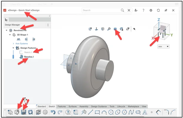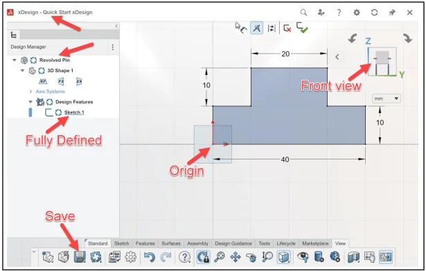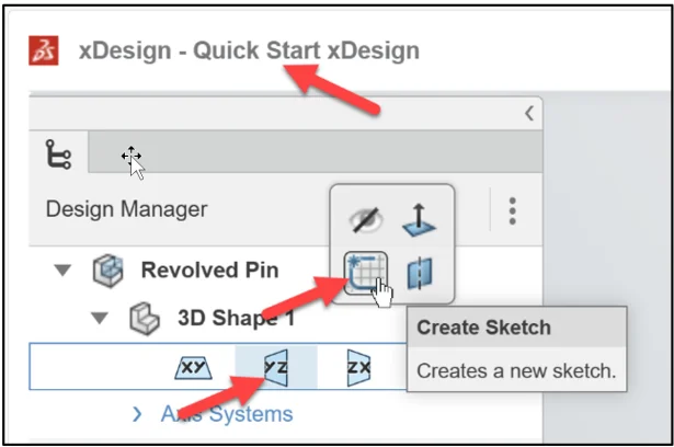 Create Sketch.1. Sketch.1 is normal to the yz plane (Front). Quick Start xDesign is the Collaborative space. When you create a new component, the three default planes (xy), (yz), (zy) are aligned with specific views. The plane you select for your first sketch determines the orientation of the part. Selecting the correct plane to start your model is very important.