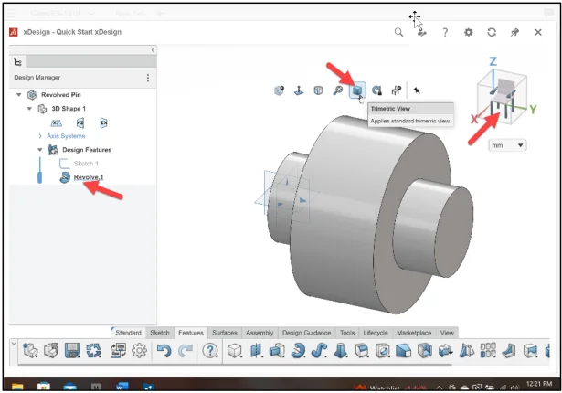 Click Trimetric View from the expansion arrow in the Work Area. Revolve.1 is created. Sketch.1 is fully defined.