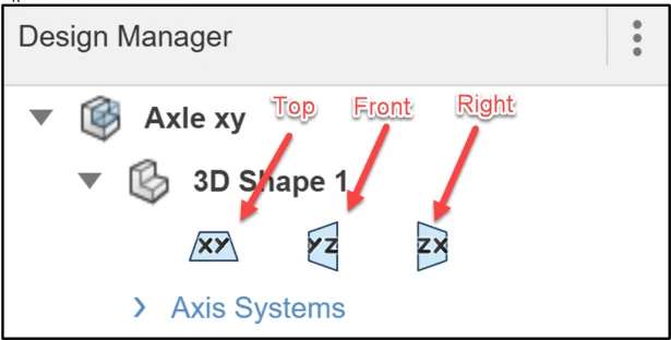 The Design Manager display is similar to the SOLIDWORKS FeatureManager. They both provide information about the Physical Product (Axle xy). The 3D Shape 1 contains geometry, sketches, and features.