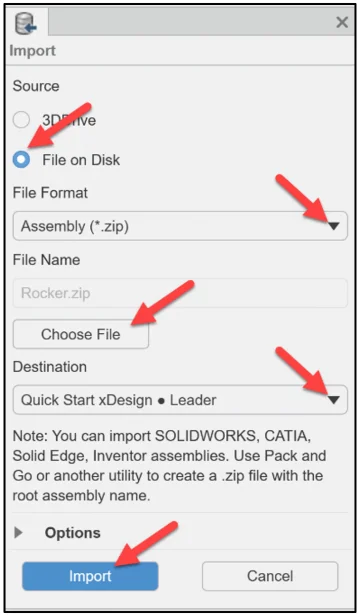 The Import box is displayed. The example used is a SOLIDWORKS Rocker assembly zip folder.