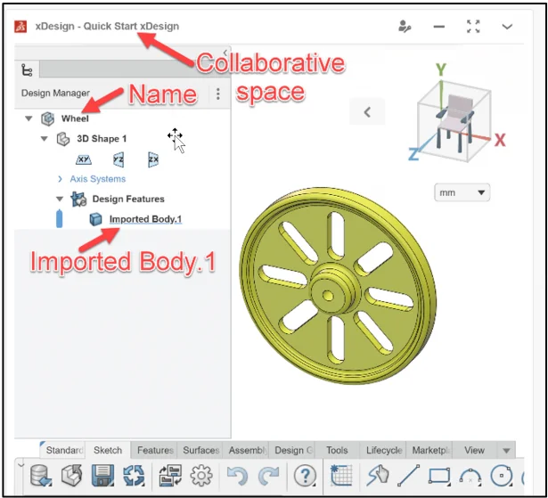 The xDesign Work Area is displayed. Wheel is the name of the Physical Product. The geometry is Imported.Body.1. The xy plane is the Front plane. The Triad displays the Y axis vertical. This is similar to SOLIDWORKS.
