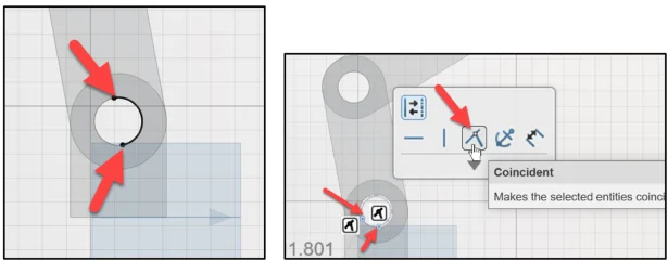 Note: With imported geometry, sometimes half of the circular edge is selected with Convert Entities. To create a closed entity, deselect Convert Entities. Drag the arc endpoints closer to each other as illustrated. Insert a Coincident constraint between the two end points of the arc.