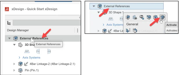 Double-click External References in the Design Manager as illustrated. Note: The visual changes in the Design Manager and Work Area. You can also right-click External References in the Design Manager and click Activate from the Content box.