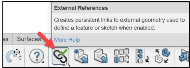 Activate the External References tool to link the created new geometry and maintain the references with changes. De-activate the External References tool (reference geometry is still created) but the geometry is not updated with new changes.