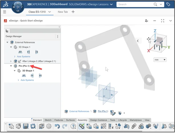 Import the xDesign components: (4Bar Linkage-2 and Long Pin) into your Collaborative space. Note: A Windows model file cannot be directly opened in xDesign. The model file needs to be imported.