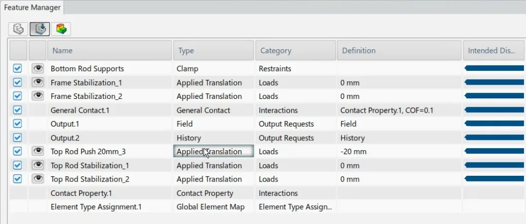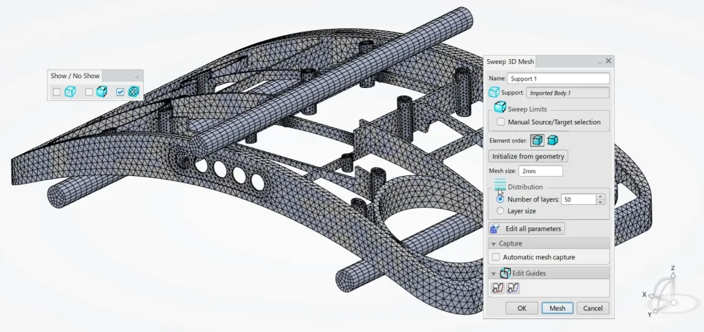 The boundary conditions, loads and material properties have all been transferred for us. For the supports beams let’s delete the mesh that came over from SOLIDWORKS Simulation and move to a nice structured swept brick mesh. This meshing scheme will help to speed up solve time while ensuring a high accuracy result. Figure 3 shows the Feature Manager available in Structural Professional Engineer, which describes the settings for the simulation. Figure 4 highlights the ability of Structural Professional Engineer to create a swept brick mesh on appropriate geometry; in this example the rods have swept brick elements.