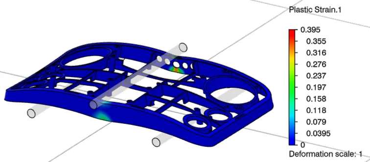 Let’s take a look at the results. We can see the model going through the full range of motion (Figure 5) and we can highlight where plastic deformation has occurred, as shown in Figure 6.