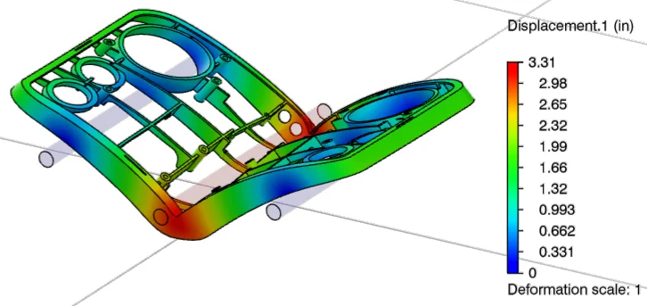 While the requirement was only for 20mm of deflection, we inspected a worse case scenario deflection of 80mm and within 10 minutes we were able to get results in SSE (Figure 7). Because of high strain, localized buckling, and complex contact, this worst case scenario was way beyond the scope of what could be solved in SOLIDWORKS Simulation.