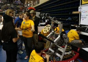 The team spent part of the practice day on Thursday getting things fixed up and the robot through inspection. Some years that would take the whole day, but this year the robot and drive team got out and ran some practice matches in the afternoon. Friday morning there were a few loose electrical connections that fortunately didn’t cost the team any matches. We had some great match play with only a few glitches that were fixed as soon as they showed up. We won all six of the Friday matches.