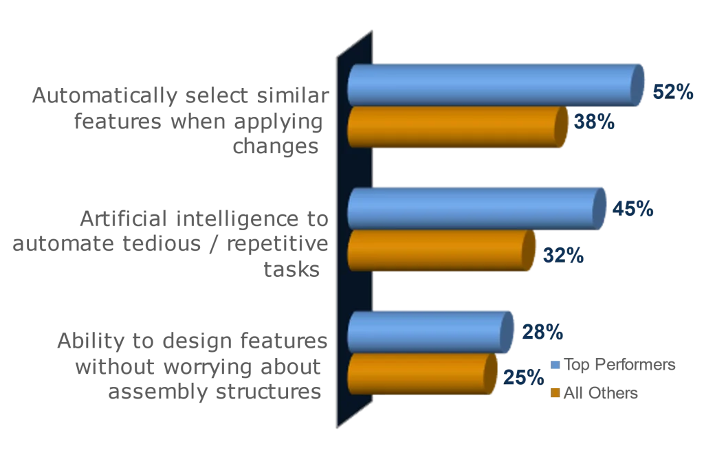 Machine designers recognize the importance of easily sharing design details, and top performers are more likely to point to the cloud as the way to make this happen. On top of this, 55% of top performers view easier collaboration as the top way a cloud platform can improve efficiency.