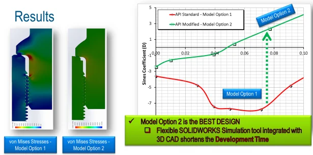 The solution for fatigue failure in Sucker Rods was to redesign the connection using stress concentration factors to achieve the optimal design. The figure below on the left shows the result for the regular API design (Option 1) and a new modified API design (Option 2). The modified design only has a shoulder angle modification that distributes the stress field in a better way compared with the regular design. On the right we have a stress coefficient comparison. The regular design shows the worst values (lower red curve) and the new design definitely show better stress coefficient (upper green curve).