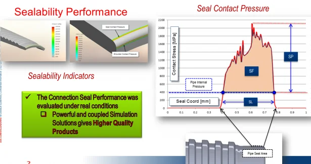 Regarding threaded connection, the Connection Seal Performance was evaluated, allowing the designer to define the critical loads. In the picture below I show the seal area (left) and the seal performance evaluation (right). I usually use three types of factors: 1) SF – seal force; 2) SP – seal peak; and 3) SL – seal length. These factors allowed me to evaluate the seal performance.