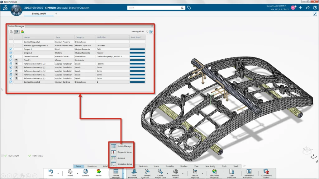 1. History Tree – Visual tree of all the components, such as geometry, loads and boundary conditions, mesh, results 2. Action Bar – Access all the features and commands 3. Assistant Panel – This is probably the easiest way to interact with the simulation data. The Assistant panel is similar to the Simulation advisor in SOLIDWORKS Simulation, in that it provides the steps that guides you through every required component of the simulation. The Assistant panel is a great way to quickly familiarize with the user interface.
