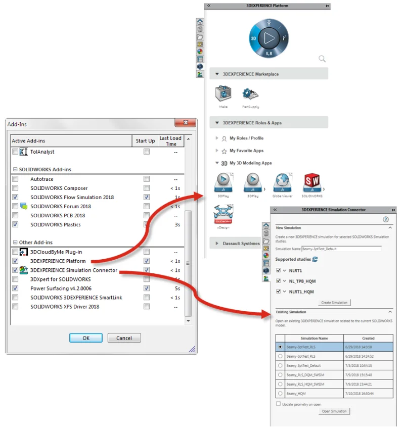To connect from SOLIDWORKS Simulation to Structural Professional Engineer, there are a couple of options. You can directly access the 3DEXPERIENCE platform from within SOLIDWORKS and then access the App using the add in “3DEXPERIENCE platform” in the SOLIDWORKS add-in window. In my case, I want to be able to transfer my nonlinear setup automatically without wasting time recreating my setup in Structural Professional Engineer. So I will use the add in “3DEXPERIENCE Simulation Connector” as shown below.