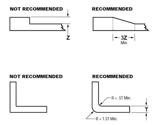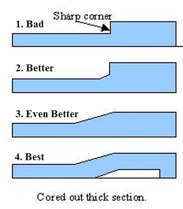 Sharp corners in plastics parts act as stress concentrators that can lead to crazing, cracking, increased susceptibility to chemical attack and ultimately, part failure – so it’s a really good idea to avoid them at all costs. The good news, it’s usually pretty easy to add fillets or chamfers to avoid sharp corners altogether as can be seen in this diagram.
