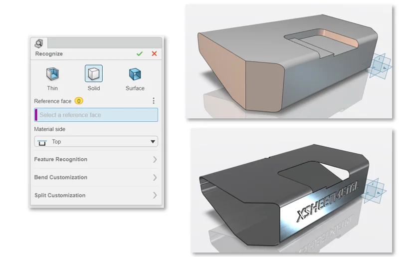 We’ve revamped our Recognize command with two new options, including solid and surface options, to easily create complex sheet metal shapes and reduce the need for complex design workflows. In addition to the existing “thin” option, you now have the ability to convert solid bodies and surfaces with automatically generated flat patterns for manufacturing that no longer require shelled or uniform thickness geometry.