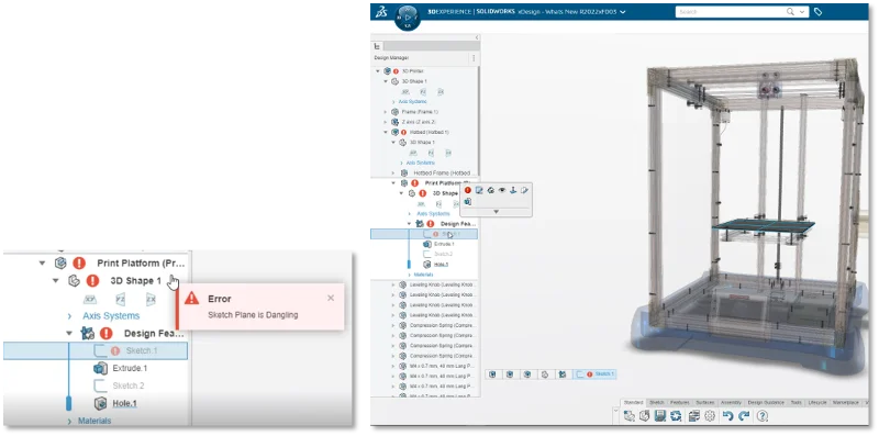 When designing assemblies its critical to ensure your design is performing and functioning as intended. To help you stay in sync with your assembly, the Design Manager will display a red icon next to any components that have errors, and you can click on the icon to view the errors. For example, you may have a mate error you need to address. This new feature will help you identify and understand exactly what the issues is for quick and easy assembly fixes.