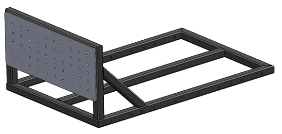 The Frame: The frame of the scrum machine consists of 80x80x6mm square tubing, requiring a mere 8 cuts to be made before they are welded together. We then add a 10mm sheet metal plate, with 20mm perforations, to the front of the frame where we will later be able to attach the scrum cushions at different heights and widths.