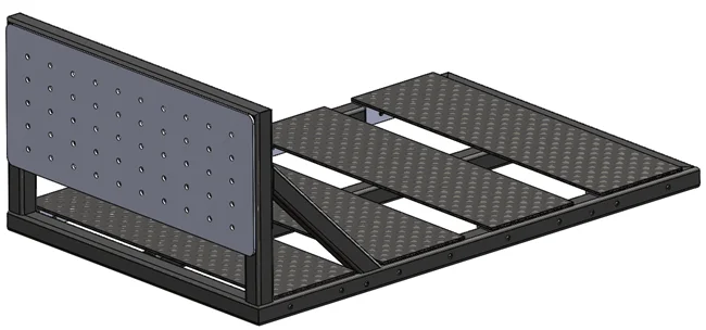 Next, we use 80x80x6 angle iron and 10mm rough-finish sheet metal to create the platform of the scrum machine. The platform consisting of 4 pre-manufactured platforms bolted onto the frame. A 6mm piece of sheet metal is added to the middle/supporting beam of the frame, acting as a spacer for the steps.
