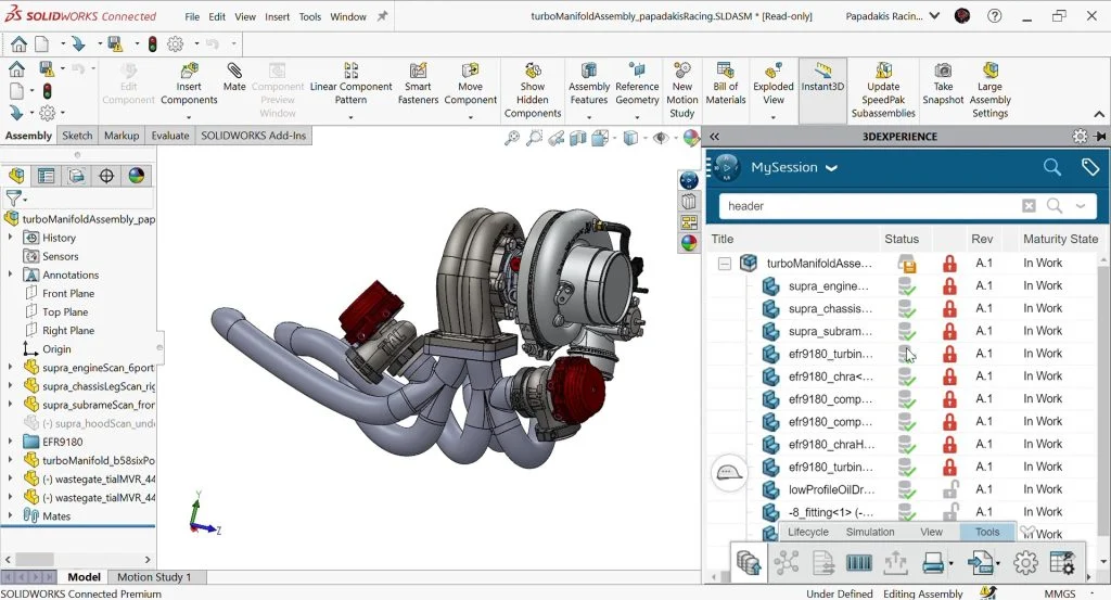 This is where 3DEXPERIENCE SOLIDWORKS (and 3DEXPERIENCE® Works altogether) comes into play. With 3DEXPERIENCE SOLIDWORKS giving Stephan and his collaborators at Full-Race shared access to SOLIDWORKS Connected, they were able to bring in scan data generated from a 3D scanning arm, and model the custom turbo header to specification around the rest of the pertinent engine components.