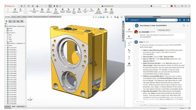 A growing number of capabilities, such as the AI-powered AURA companion and performance improvements, such as selective loading, will be available only in SOLIDWORKS Design connected to the platform, making the platform irresistible. The platform helps you extract knowledge with a powerful virtual companion, enables you to work more easily with large assemblies, capture every aspect of your design as a virtual twin, and so much more.