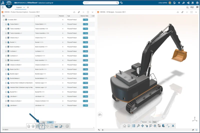 For example, without selective loading, if a design team is working on an excavator, and one person is working on the hydraulics and another on the engine or interior cabin design, you’d have to load the entire excavator. This is time-consuming, and when it’s loaded, it can use up many resources on your system. With selective loading, you can create a filter and define what to load. Everyone who is working on the excavator can see all changes happening in real-time. This is a huge performance improvement, as you can define the context using filters that apply to the sections you want to see.