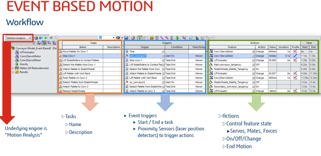 The webinar wraps up discussing key challenges using motion analysis to analyze big complex machines with servos and sensors. These challenges can be easily addressed using Event Based Motion (EBM) analysis. A screenshot of the workflow in EBM is shown below.