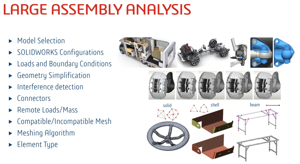 In this webinar, we highlight some of these judgement calls when doing FEA for large assembly analysis. Also reviewed are some of the specific tools within SOLIDWORKS Simulation that make it easier to run a Simulation more effectively.