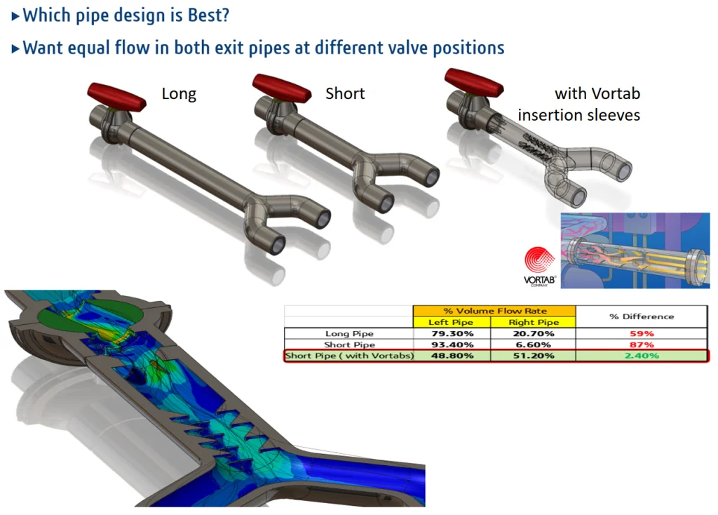 Example #1: Piping System – Comparing different design scenarios in a piping system. The best design here is the short pipe with the Vortab insertion sleeves as shown in the result summary.