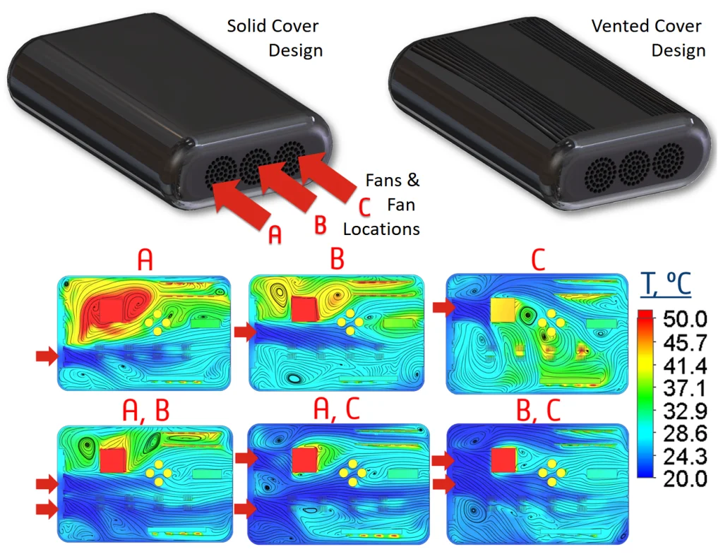 Example #2: Electronics Enclosure – In this example, we first select which packaging works better for thermal distribution: solid cover or vented cover design. Then, we address how many fans are needed and what the best location of these fans should be for optimal cooling. Results below show the temperature distribution in some of the different design cases in order to choose the best package option as well as the number of fans needed along with their optimal locations.