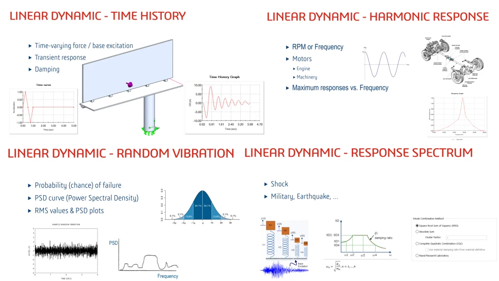 Terminologies, such as frequency, damping, harmonics and Power Spectral Density, were explained. Natural frequency and linear dynamics are reviewed, more specifically the study types of Time History, Harmonic Response, Random Vibration and Response Spectrum.