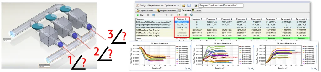 Example #3: Heat Exchanger – In this example, the Optimization tool in SOLIDWORKS Flow Simulation is used to automatically drive the angular flap angles to their optimal values in order to achieve an equal flow rate of the fluid in each one of the channels. Optimization uses a Design of Experiments (DOE) technique by running different experiments and using a user-defined objective or goal to choose the optimal solution.