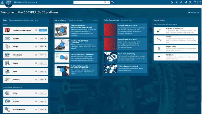 Whether you’re a new or novice user, the Welcome app in the 3D Creator parametric design role is going to help you get up to speed on your roles and apps fast. Directly from the app you can access beneficial resources, such as tutorials, the SOLIDWORKS online communities and even switch between your roles. For instance, in the Learning Center, you’ll find tips for getting started, short video tutorials, and access to more in-depth learning tutorials. It also features Sample Content where you can drag and drop a model to your interface to check out the role’s modeling features.