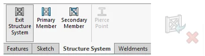 To start, the Structure System feature is selected from its own tab. A sub-environment like when starting a sketch is entered. Primary members can then be defined, followed by secondary members. A ‘confirmation corner’ icon is available to exit the sub-environment. Note that if members have been defined before exiting, you will first enter the second part of the feature, corner management. This will be gone over later.