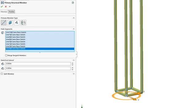 Primary members can be defined through using planes, sketch segments, points, and intersections. Primary members therefore rely on reference geometry for their path. Unlike Weldments, the members do not need to be parallel or consecutive to each other. They may also be defined using splines and can use different profiles.