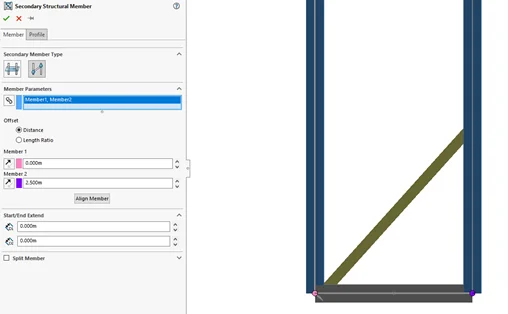 Secondary members use primary members to define their positioning to quickly build up supporting weldments. The distance along / length ratio of the primary member is used to define them. Note that initial selections are rough distances and then the values should be defined afterwards. Pre-created planes can also be used for positioning. Finally, these members can even use primary members from other Structure System features, making it easier than ever to build up large structures piece by piece.