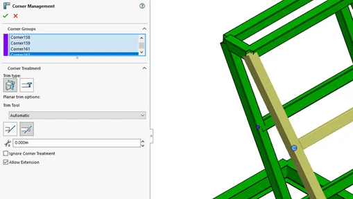- The corner management folder is a process-heavy feature and suppressing this can speed up the rebuild time significantly. Use this to your advantage when refining the initial framework sketches and members. It will allow you to work in and out of the structure system feature quickly when creating new members without having to wait for all corners to be built. Just remember to unsuppress afterwards once complete.