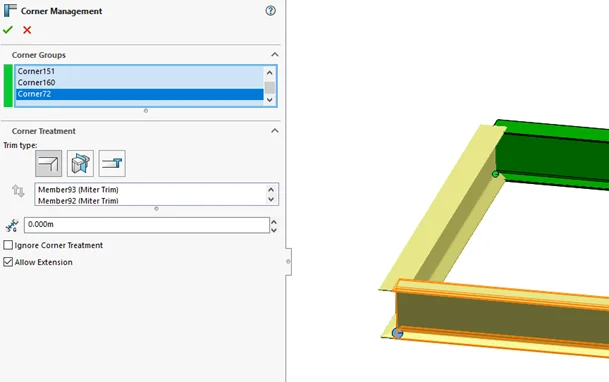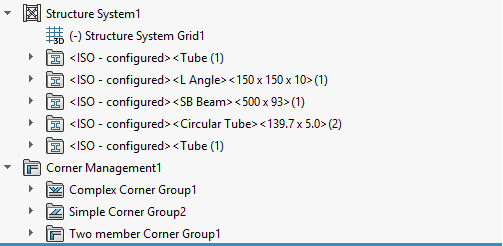 The last folder is for the corner management. One of Structure System’s main advantages is all corners are trimmed automatically between all profiles. Like structural members, the corners can be modified individually or as a group. The easiest way is to edit the sub-folder the corner belongs to and then find the corner from the graphics area.