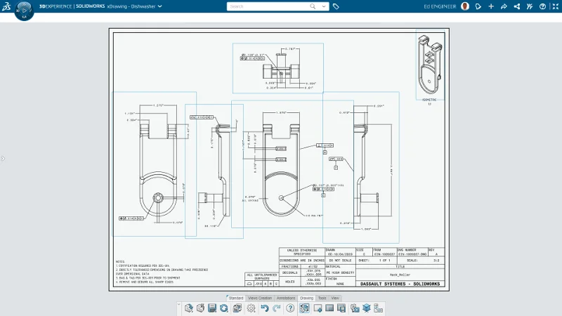 Create a single source of truth between 2D and 3D for manufacturing documentation. Add views, dimensions, and tolerances directly within the 2D drawing environment and 3D annotations and views will automatically be created, ensuring consistency and accuracy across both forms of definition.